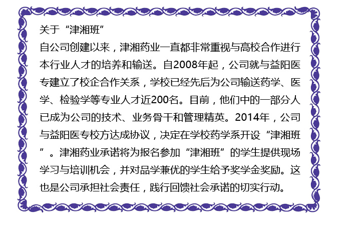 2015年12月17日下午三時(shí)許,益陽(yáng)醫(yī)學(xué)高等專(zhuān)科學(xué)校(下文簡(jiǎn)稱(chēng)為“益陽(yáng)醫(yī)專(zhuān)”)2014級(jí)“津湘班”獎(jiǎng)學(xué)金頒獎(jiǎng)儀式在津湘藥業(yè)總部辦公樓三樓會(huì)議