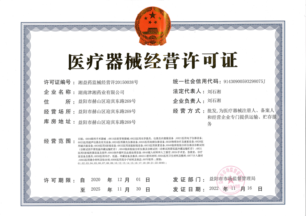 湖南津湘藥業(yè)有限公司二零二零年十二月獲得醫(yī)療器械經(jīng)營許可證