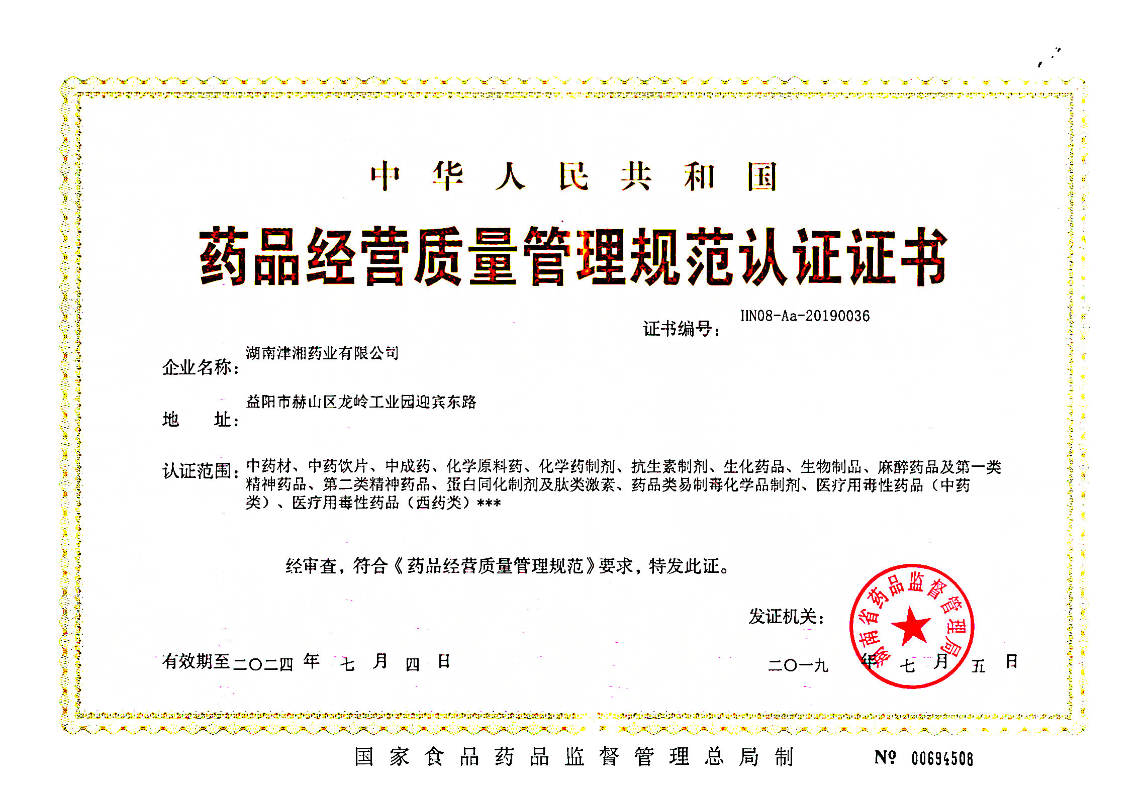 湖南津湘藥業(yè)有限公司二零一九年七月獲得GSP認證