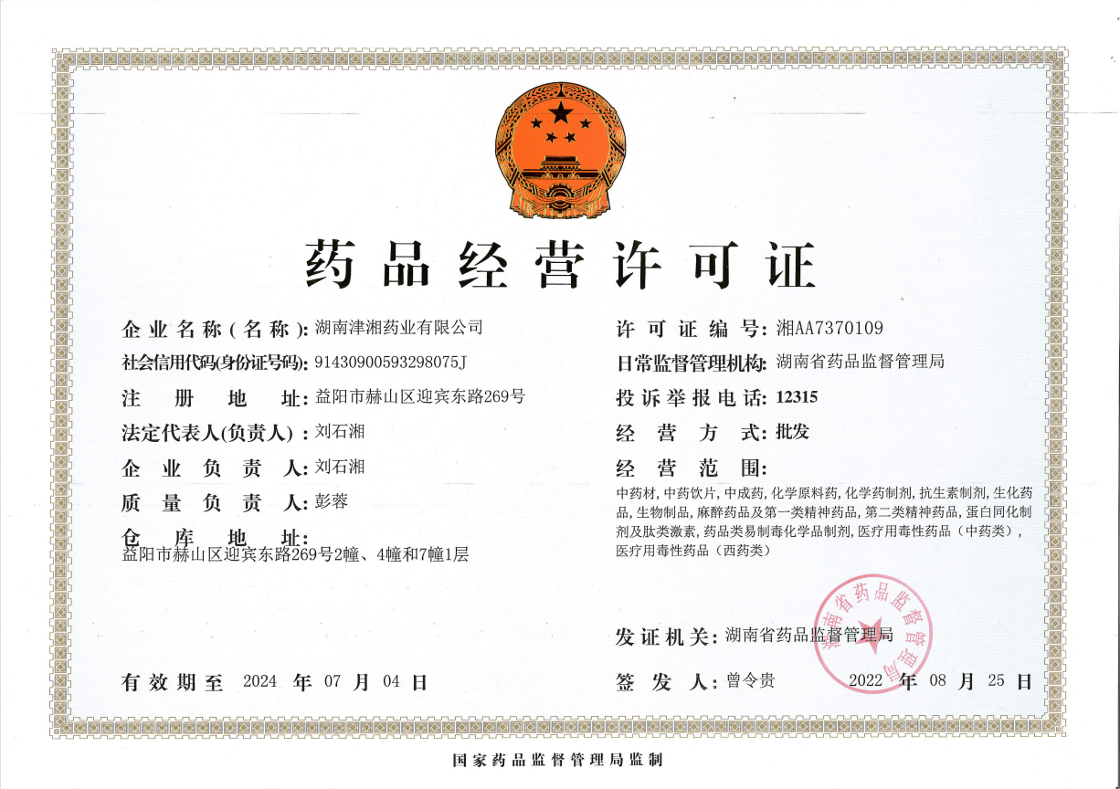 湖南津湘藥業(yè)有限公司二零二二年八月獲得藥品經(jīng)營許可證